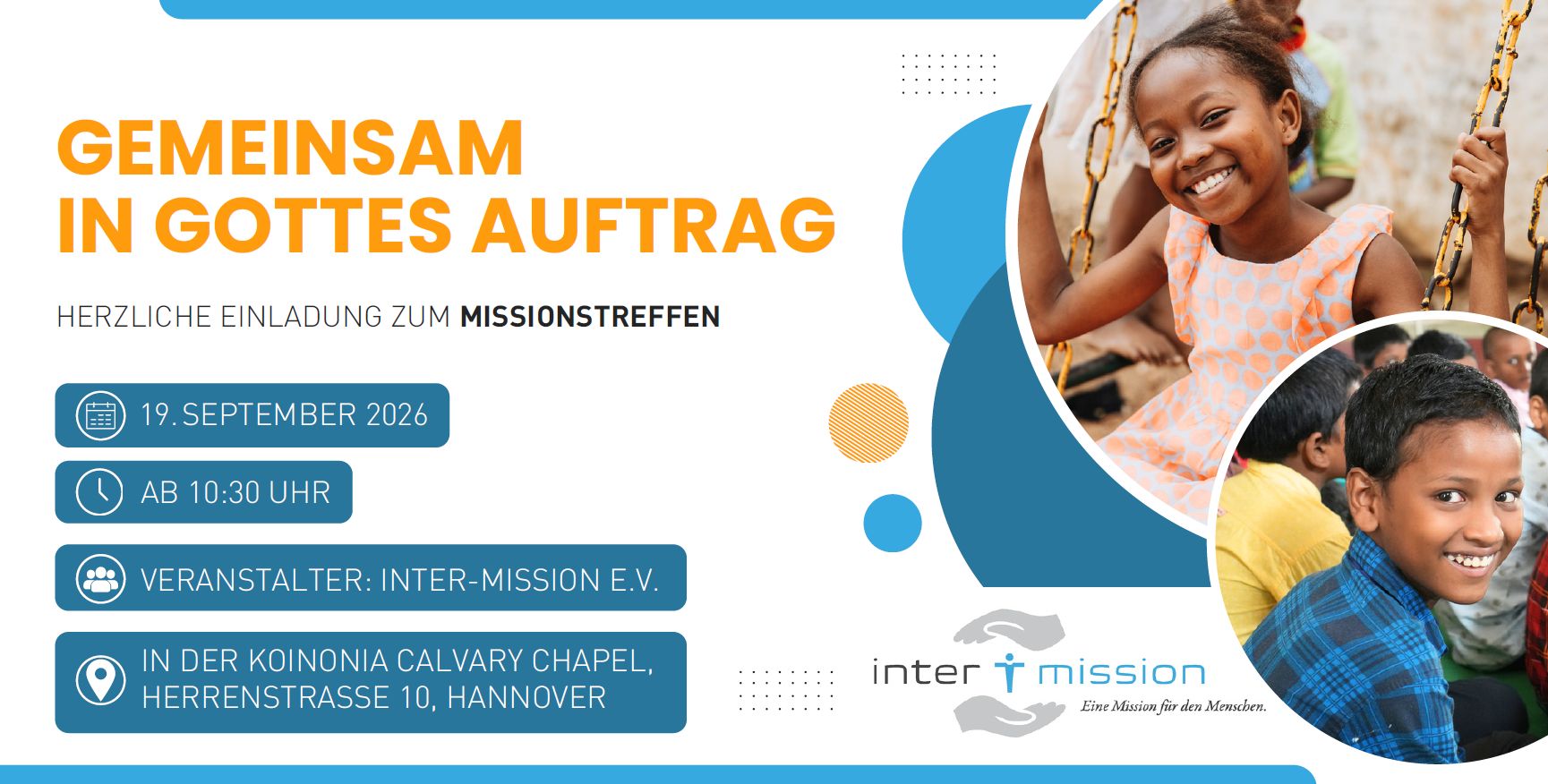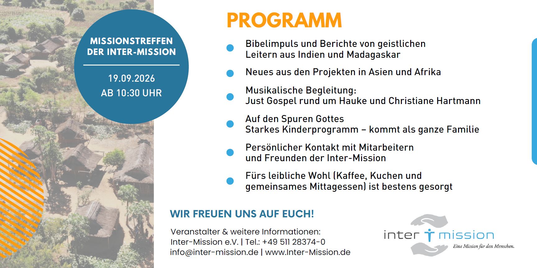 Unsere Mitarbeiter lassen sich in Kirchen und Gemeinden einladen. Wir halten interaktive Themenvorträge über Mission, Glaubens-, Bibel und Berufungshemen, erzählen Erlebnisse mit Gott, predigen oder beschreiben Hilfsprojekte in Ländern wie Indien, Madagaskar, Sierra Leone oder Uganda. Gerne begegnen wir euch live …
